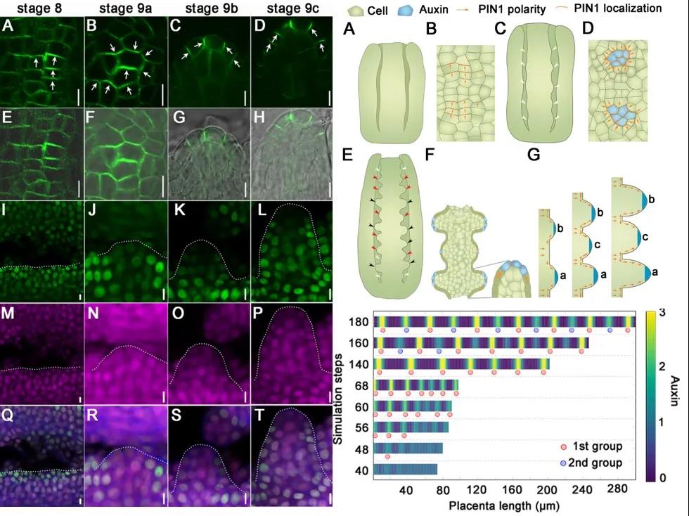 该研究接着探索了胚珠异步发生的调控机制。胚珠发生可视作一种特殊的侧生器官起始,已知生长素在茎顶端分生组织上侧生原基起始中发挥重要作用。该研究发现,在胚珠发生之前,生长素极性运输载体PIN1在部分胎座细胞的细胞膜中定位增强,这些PIN1信号增强的细胞聚集的位置就是胚珠原基起始的位置;胚珠发生过程中,PIN1朝向胚珠原基顶端定位,导致胚珠原基顶端出现生长素高峰;第一批胚珠发生之后,PIN1极性定位发生逆转,使部分生长素回流到胚珠原基之间的胎座上,在两个已起始的胚珠原基之间的边界上形成新的生长素高峰,引起第二批胚珠发生。该研究进一步通过数学方法将生长素动态变化以及胎座伸长模型化,模拟了胚珠原基不同步起始的过程。运用生长素极性运输抑制剂NPA在第一批胚珠发生后阻断生长素的极性运输,会抑制第二批胚珠发生,而已经起始的胚珠原基可以继续生长,导致胚珠数量下降。另外,油菜素甾醇BR通过增大胎座和提高生长素信号响应来促进胚珠发生并增加胚珠数量,可佐证生长素的动态变化调控了胚珠发生的异步性,也解释了为何较大的胎座会产生较多的胚珠。胚珠发生的异步性具有重要的生物学意义,植物可通过监测已有胚珠间距大小来判断自身营养和所处环境是否适合第二批胚珠发生,进而控制子代数量。
