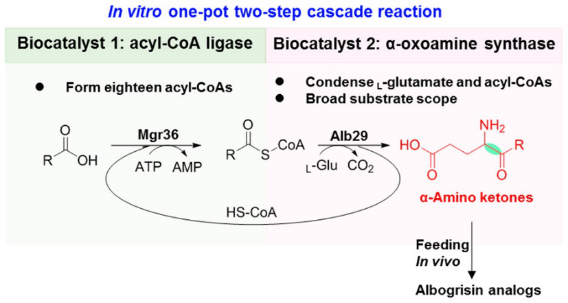 The cover graphic illustrates a one-pot two-step enzymatic reaction to synthesize different α-amino ketones. An α-oxoamine synthase (Alb29) involved in albogrisin biosynthesis in Streptomyces albogriseolus MGR072 was characterized and used for the incorporation of L-glutamate to acyl-coenzyme A substrate. Meanwhile, an acyl-coenzyme A ligase (Mgr36), which is mined from the genome of the same strain, was exploited to provide the corresponding acyl-CoA using carboxylic acid and HS-CoA. In this system, HS-CoA was internally recycled.
