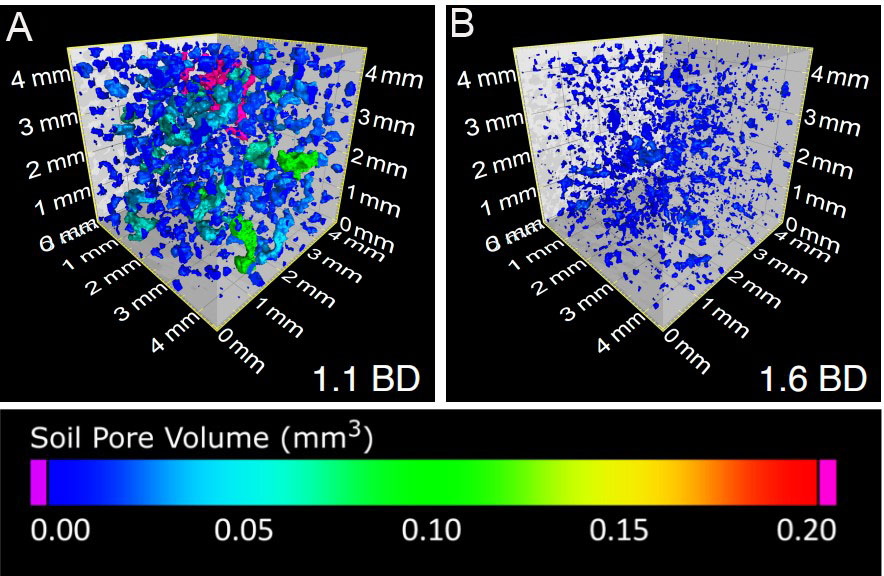 (A)疏松土壤内部扫描立体结构图,充斥着较多的孔隙(蓝色区域);(B)坚硬土壤内部扫描立体结构图,孔隙数目显著低于疏松土壤。