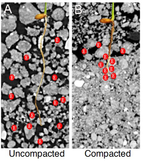 伴随着世界人口的急剧增长,人类对粮食的需求量不断激增,无机化学肥料的使用量逐年增加,导致土壤的硬度变大,土壤板结以及透气性变差(图1)。植物在硬度较大的土壤中生长,生长变差、产量降低。因此,人类在作物种植前,不得不进行耕地松土,消耗大量的资源。如何培育能够适应不同硬度土壤的作物新品种,是一个亟待解决的问题。