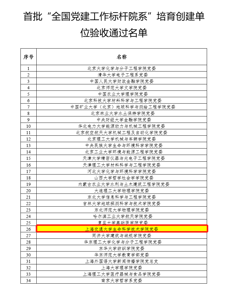 近期,教育部思想政治工作司开展了首批全国党建工作示范高校、标杆院系、样板支部培育创建单位验收评估。生命科学技术学院党委经对标自查总结、上级党组织满意度测评、属地教育工委把关复核、教育部思想政治工作司审查,顺利通过验收。