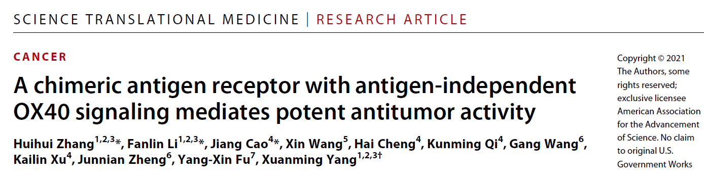 近日,国际知名期刊Science Translation Medicine在线发表了上海交通大学生命科学技术学院长聘副教授杨选明课题组最新研究成果“A chimeric antigen receptor with antigen-independent OX40 signaling mediates potent antitumor activity”,并被Science Translation Medicine杂志online图文推荐。该研究首次发现抗原非依赖OX40信号,为提高CAR-T细胞抗肿瘤活性、突破实体肿瘤治疗挑战提供了新策略。上海交通大学生命科学技术学院杨选明为通讯作者,上海交通大学博士生张会会、李范林和徐州医科大学曹江主任医师为共同第一作者,上海隆耀生物科技有限公司负责临床治疗所需CAR-T的制备。