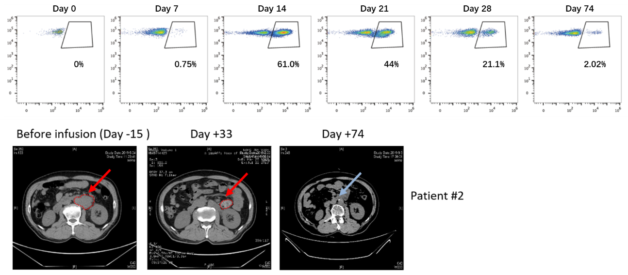20BBZ-OX40 CAR-T在患者#2体内的扩增(上) 和抗肿瘤能力(下)