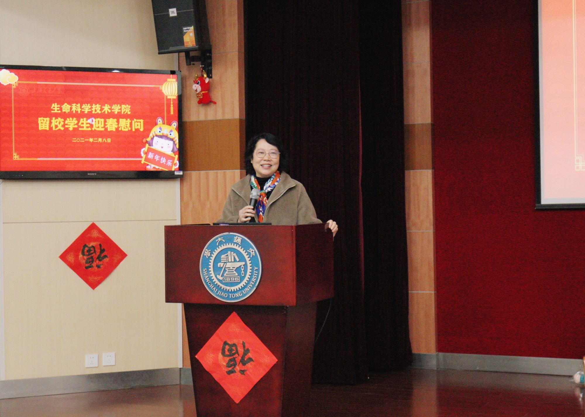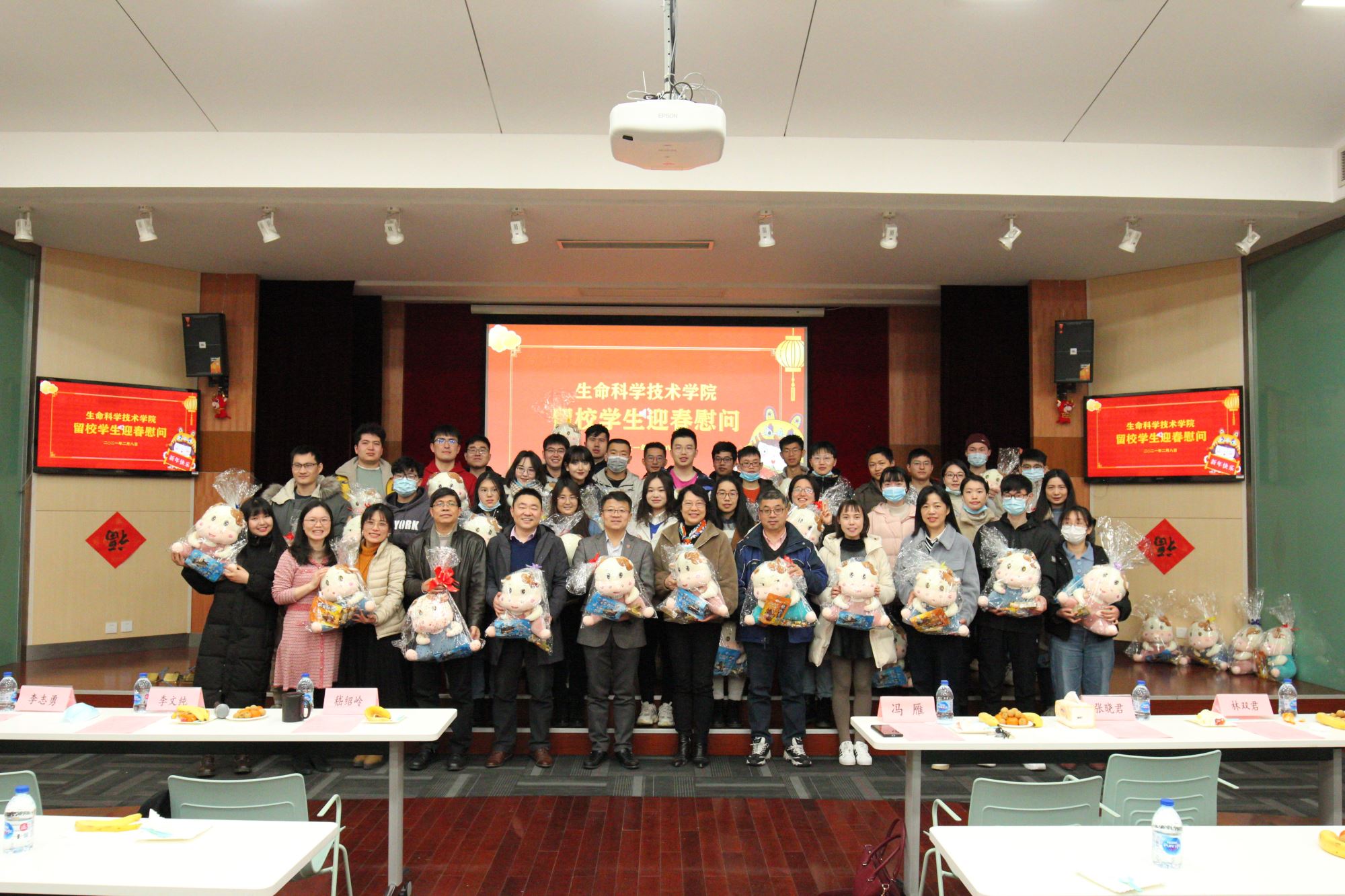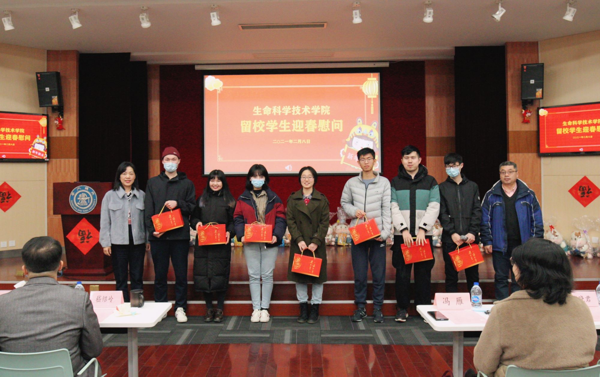 张灯结彩辞旧岁,师生欢度迎新年。为了让留校学生在校园里品味到家乡的“年味”,2月8日,生命科学技术学院在树华多功能厅举办留校学生新春慰问活动。学院党委书记嵇绍岭,常务副院长冯雁,党委副书记李文纯,副院长李志勇、林双君,院长助理蒋群,学生办主任刘燕芳、思政教师李芳、辅导员戴迪,留校学生代表等出席活动。新春慰问会由刘燕芳主持。