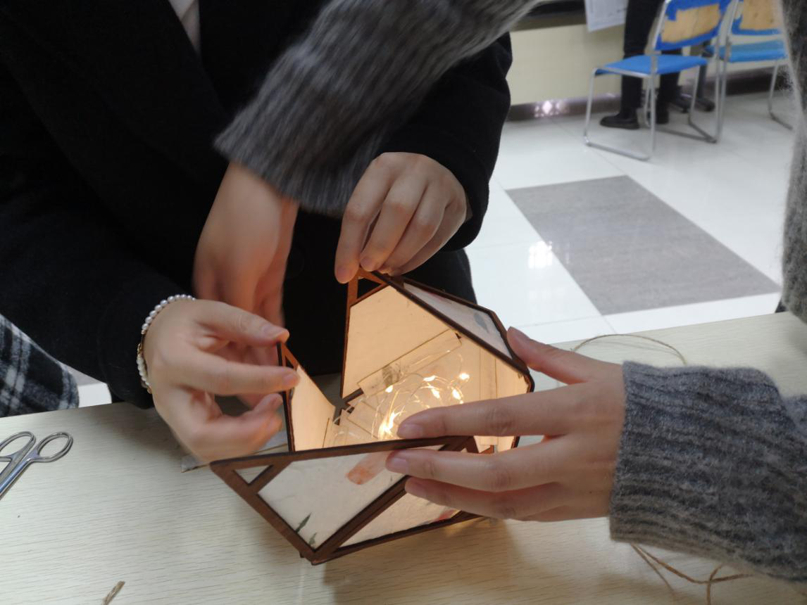 同学们现场制作元宵灯。精美的元宵宫灯寓意团圆美满,同学们在参与过程中配合默契,制作后纷纷合影留念。