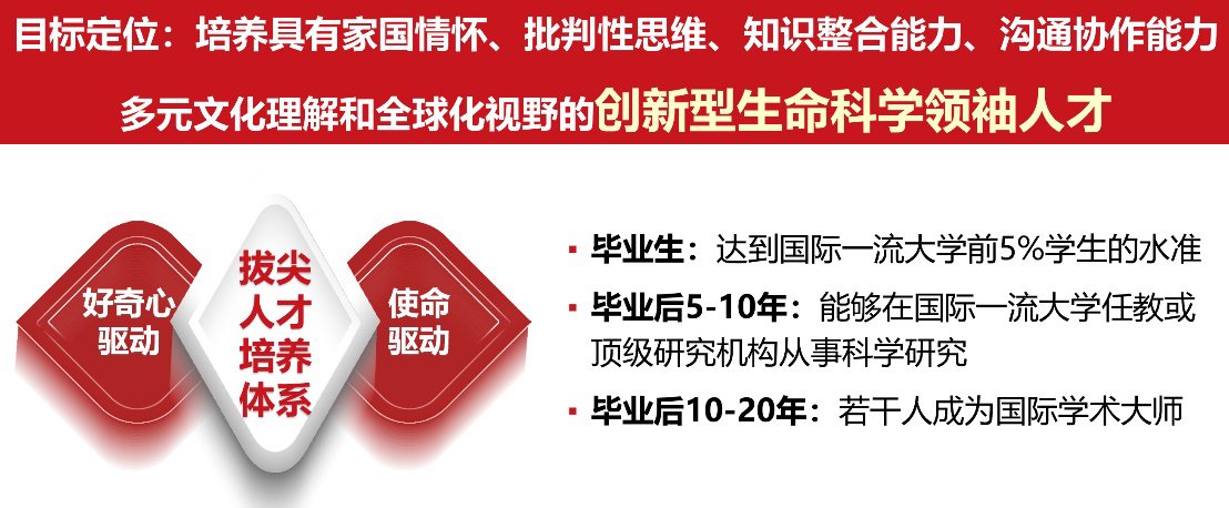 生物科学专业依托教育部基础学科拔尖计划2.0,为我国基础学科发展奠定坚实的人才基础,为中华民族伟大复兴提供有力的人才支撑。专业以多元化招生方式、“好奇心驱动”小班化致远模式、“转身遇到大师”国际化学术氛围、重数理强交叉的国际整合科学课程理念为特色,培养拔尖创新领袖人才。