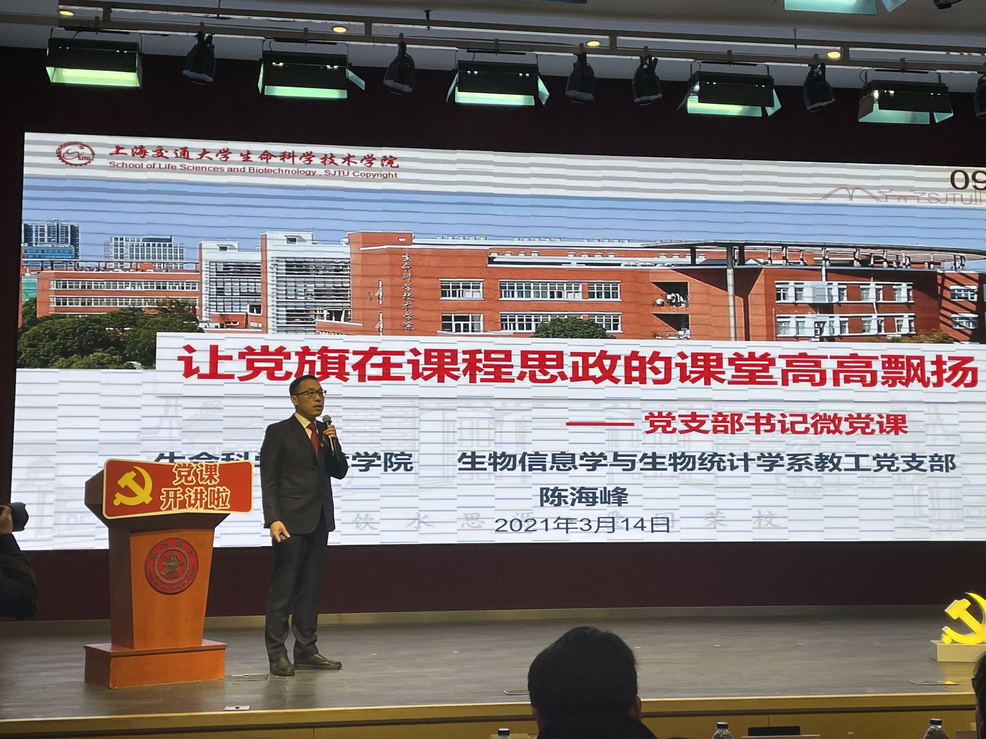 3月14日,生命科学技术学院生物信息学与生物统计学系教工党支部书记陈海峰参加上海交通大学“党课开讲啦”党支部书记微党课大赛,以“让党旗在课程思政的课堂高高飘扬”为主题讲述微党课,获评微党课大赛三等奖。