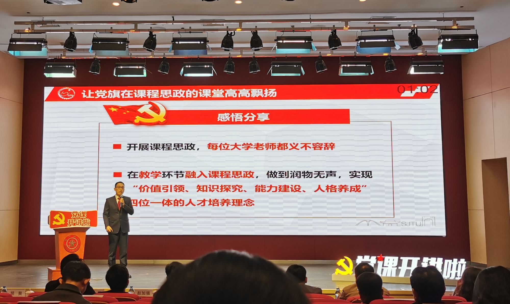 最后,陈海峰分享了自己开展课程思政的感悟。开展课程思政,每位大学老师,特别是党员教师都义不容辞。他号召党员们聚焦课程思政,在专业课的教学环节融入课程思政,做到润物无声,实现“价值引领、知识探究、能力建设、人格养成”四位一体的人才培养理念,让党旗在课程思政的课堂高高飘扬,以实际行动迎接建党一百周年。