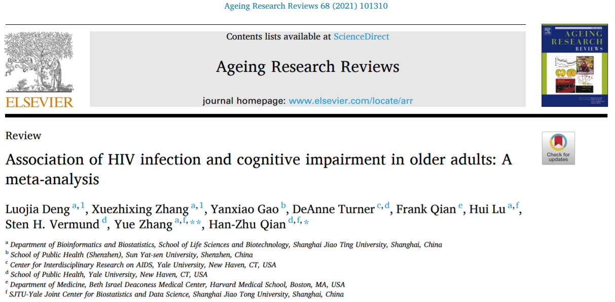 近日,上海交通大学生命科学技术学院生物信息学与生物统计学系、上海交大-耶鲁生物统计与数据科学联合中心团队在《Ageing Research Reviews》(IF: 10.616)上发表题为Association of HIV-infection and Cognitive Impairment in Older Adults: A Meta-analysis的荟萃分析论著。上海交通大学生命科学技术学院一年级博士生邓罗佳和本科生张薛知行为共同第一作者,耶鲁大学钱汉竹教授和上海交通大学张岳副研究员为共同通讯作者,上海交通大学生命科学技术学院生物信息学与生物统计学系为该文章第一通讯单位。中山大学博士生高延晓、耶鲁大学博士后DeAnne Turner、哈佛医学院Frank Qian医生、上海交通大学吕晖教授和耶鲁大学Sten H. Vermund教授为共同作者。该研究主要工作由两位共同第一作者在本科阶段完成,研究采用meta分析整合现有经验证据研究HIV感染在老年人群中和认知障碍的关联。