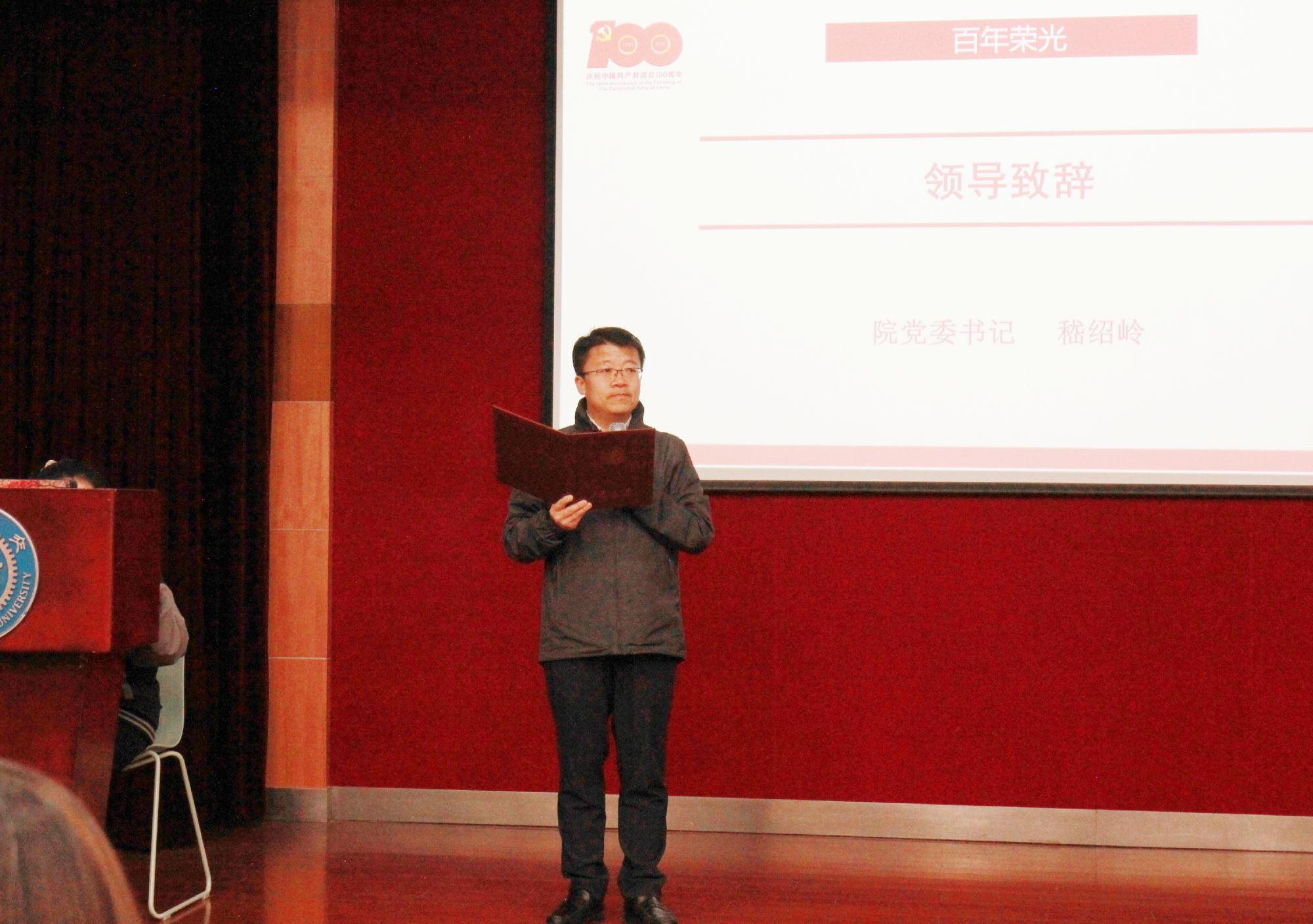 嵇绍岭致辞,他对以史促学、以赛促学的活动形式表示肯定,并指出,我们生科人应该用行动践行爱国誓言,肩负起为健康中国贡献力量的历史使命,全体师生党员要善于从党的百年历史、奋斗历程中获取力量和信心,在党史的学习中探究历史规律,以实际行动和优异成绩庆祝建党一百周年。