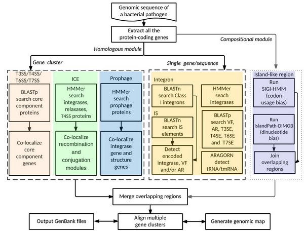 目前细菌基因组岛的识别软件主要采用了GC含量、二核苷酸分布和密码子使用等序列特征变量;VRprofile软件则提出了“功能模块为主,序列特征为辅”的新方法,获得了更高的预测精度。它在单基因和基因簇两个水平上表征了基因组岛、原噬菌体、跨膜分泌系统等长元件的核心组件,按不同种类元件设计了算法(图1)。例如,先用profile HMM查找特征蛋白同源基因,再用基因簇共定位方法来识别岛的整合和接合模块。VRprofile在线工具的输入界面支持全基因组序列或未注释contigs;输出界面可将识别结果和已知基因组岛进行比对。此外,VRprofile服务器还提供了其他3个功能互补的在线软件:细菌基因组快速注释工具CDSeasy,保守基因簇识别工具CGCfinder,COG基因集共定位工具COGviewer。