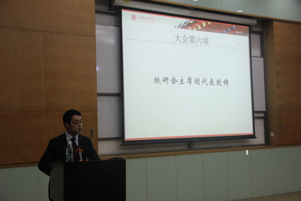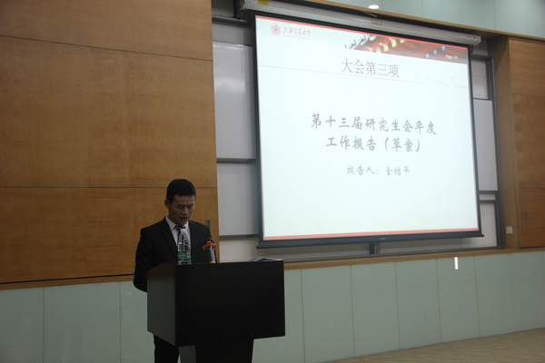 在神圣而庄严的国歌声中,大会拉开了帷幕。第十三届研究生会主席金结平从“立足常规,站好每一班岗”、“学在交大,营造浓厚学术氛围”、“职在必行,关注学生求职发展”、“留学生在身边,感受文化碰撞”、“爱好体育,丰富校园生活”等五个方面回顾了一年以来第十三届研究生会所做的工作。