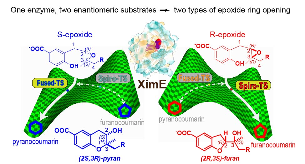 近日,美国化学会催化领域顶级期刊《ACS Catalysis》在线刊发了上海交通大学生命科学技术学院、微生物代谢国家重点实验室赵一雷教授团队在酶催化分子机制研究上的最新进展,“Computational Exploration of How Enzyme XimE Converts Natural S-Epoxide to Pyran and R-Epoxide to Furan”。该工作阐明了厦门霉素生物合成途径中XimE环化酶的独特催化机制,揭示了两种相反手性的环氧化底物在酶催化下分别合成苯并杂环衍生物呋喃香豆素和吡喃香豆素两种不同环化产物的微观过程,这种二分杂合特性填补了酶分子生物进化过程特异性转化的关键一环。