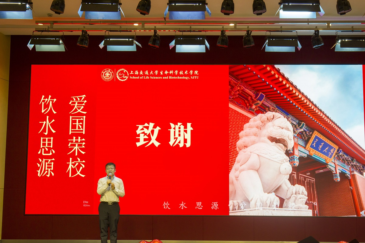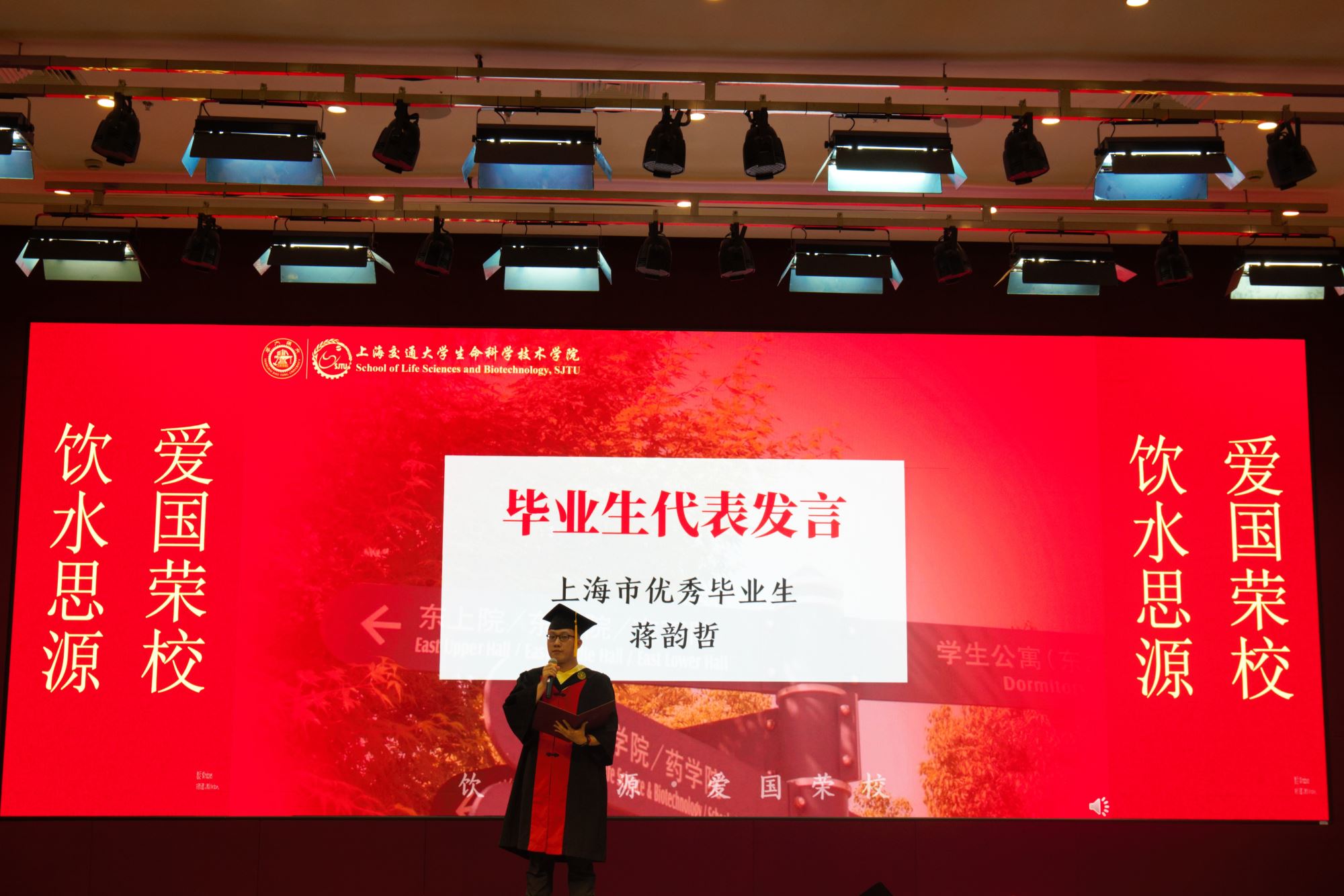 研究生代表、上海市优秀毕业生张效禹发言。他回顾了自己在交大学习的点点滴滴,对导师的教导、老师们的栽培以及亲友们的支持表示感谢。他号召同学们牢记生科人的初心和使命,砥砺奋进以求祖国繁荣昌盛,用实际行动践行爱国誓言。本科生代表、上海市优秀毕业生蒋韵哲发言。他对学院、学校的培养表示感谢,并表示,大学四年,不仅获得了知识,还形成了追求卓越的思想,养成了热爱学习的习惯,形成了科学严谨的态度。他号召每位同学都能笃行致远,为实现中华民族的伟大复兴做出自己的贡献。