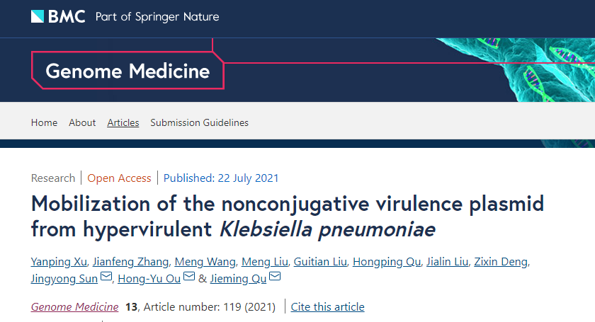 近日,生物学知名刊物《Genome Medicine》发表了上海交通大学生命科学技术学院微生物代谢国家重点实验室和上海交通大学医学院附属瑞金医院的合作论文,报道了肺炎克雷伯菌非接合型毒力质粒在接合质粒辅助下的非自主转移。瑞金医院博士生徐燕萍和生命科学技术学院博士生张剑峰为论文共同第一作者,瑞金医院呼吸与危重症医学科瞿介明教授、生命科学技术学院欧竑宇教授和瑞金医院临床微生物科孙景勇副主任技师为论文的共同通讯作者。