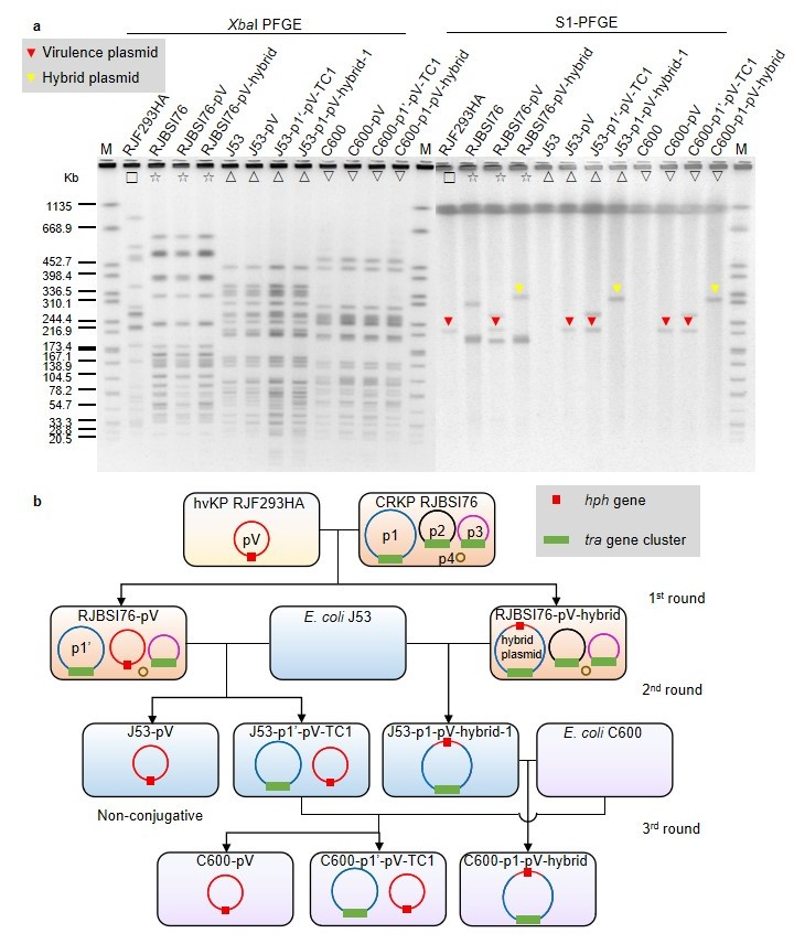 肺炎克雷伯菌(Klebsiella pneumoniae)是一种肠杆菌科条件致病菌,是我国临床分离最常见的革兰阴性耐药菌之一。肺炎克雷伯菌通常被分为经典肺炎克雷伯菌(cKP)和高毒力肺炎克雷伯菌(hvKP)两种菌型。cKP常携带耐药质粒,如IncF接合质粒编码碳青霉烯酶KPC。hvKP常携带编码粘液调节子和铁载体等重要毒力因子的非接合型质粒。近年来,出现了多重耐药合并高毒力的肺炎克雷伯菌临床株,对抗感染治疗产生巨大的挑战。这类高毒力高耐药菌株可能通过两种途径演化而来:(i) 高毒株hvKP从cKP获得了可自主转移的耐药质粒;(ii) 耐药株cKP从hvKP中获得了可转移的毒力质粒。但目前缺乏毒力质粒在cKP和hvKP间转移等关键的遗传学实验证据。近期有文献报道,在cKP临床菌株中发现了毒力质粒与耐药质粒形成的杂合质粒,可接合转移;以及耐药质粒和毒力质粒共存于一株cKP中,毒力质粒可单独转移,或通过和接合型耐药质粒融合后共同转移。然而,临床上常见的hvKP分离株仅含一个pLVPK样的毒力质粒;这种典型的毒力质粒缺少IV型分泌系统基因簇,为非接合型,它的转移机制尚不清楚。