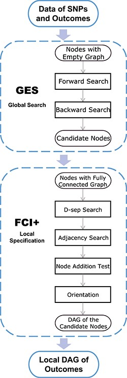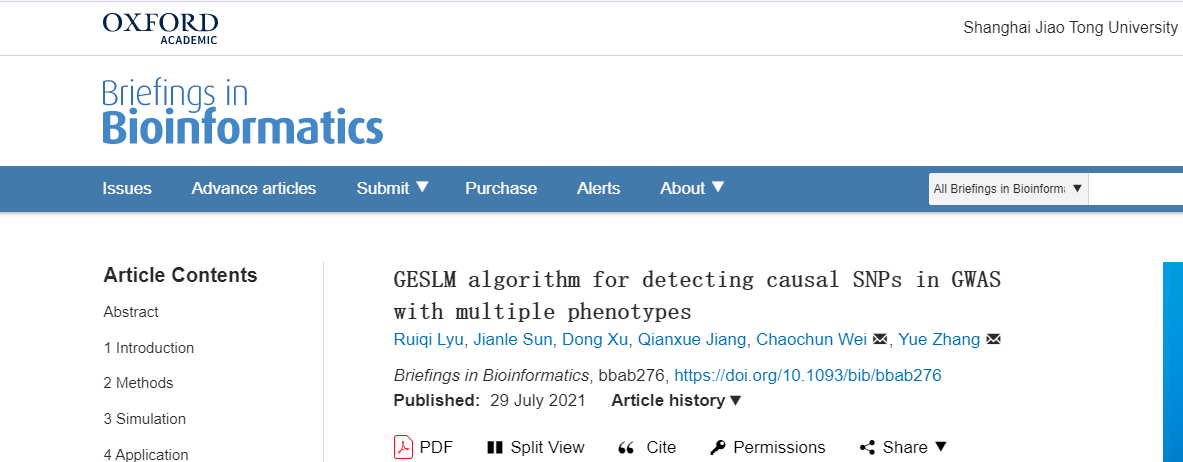 近日,上海交通大学生命科学技术学院生物信息学与生物统计学系、上海交大-耶鲁生物统计与数据科学联合中心团队在《Briefings in Bioinformatics》(IF: 11.622)上发表题为“GESLM algorithm for detecting causal SNPs in GWAS with multiple phenotypes”的全基因组关联分析算法论著。上海交通大学生命科学技术学院在读三年级本科生吕瑞祺为第一作者,上海交通大学韦朝春教授和张岳副研究员为共同通讯作者,生命科学技术学院生物信息学与生物统计学系为该文章第一通讯单位,生命科学技术学院四年级本科生孙健乐、三年级本科生徐栋和蒋千雪为共同作者。该研究主要基于第一作者作为上海交通大学2020年 iGEM软件队(SJTU-software)队长期间的工作,所有共同作者均为本科生。本研究开发了一个全基因组关联分析的两阶段全局搜索算法,通过贪婪等价搜索(Greedy Equivalence Search, GES)和基于约束的局部修改(Fast Causal Inference+, FCI+),以实现对多表型相关的单核苷酸多态性(single-nucleotide polymorphisms, SNPs)的有向无环图的全局搜索。