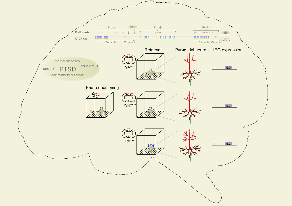 综上所述,Pyk2通过不依赖自磷酸化的方式,调节基因表达、树突和树突棘的动态变化,最终抑制小鼠的场景关联的恐惧记忆(图2)。本研究阐明了Pyk2在场景关联恐惧记忆中的潜在机理,丰富了学习和记忆形成的调节网络,为进一步研究原钙粘蛋白、Pyk2信号轴关联的精神疾病(如阿尔茨海默病)和恐惧疾病(如PTSD)的病理机制提供参考意义。
