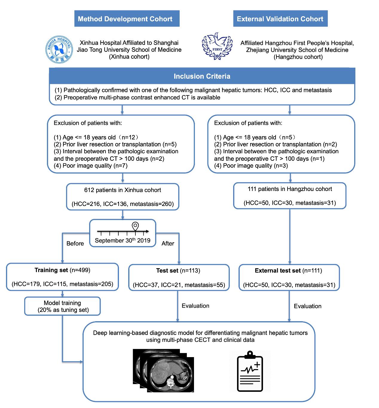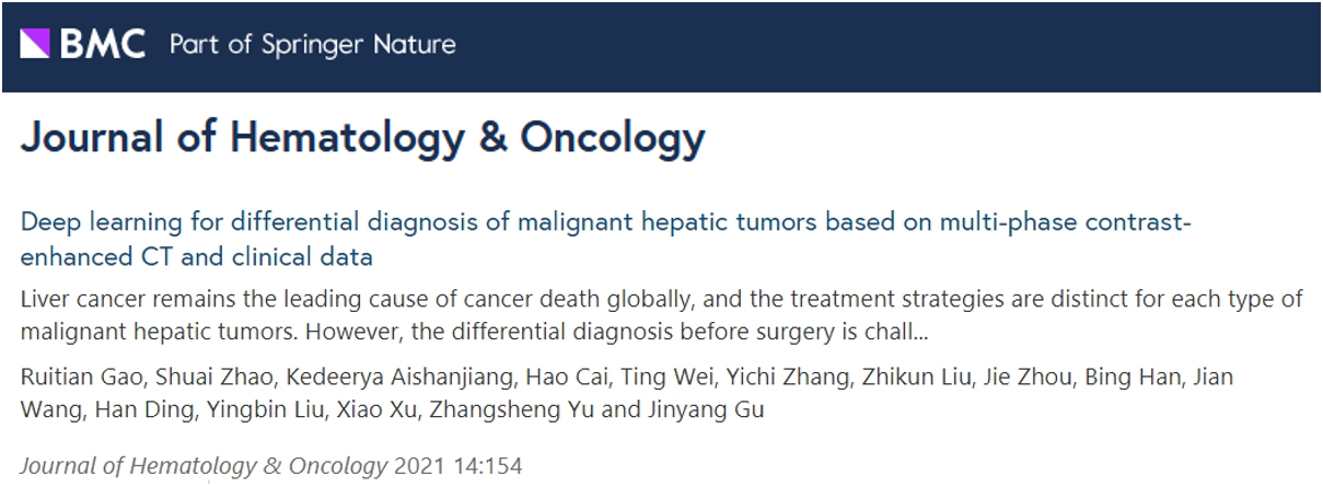 肝恶性肿瘤包括肝细胞癌(HCC)、肝内胆管细胞癌(ICC)和转移性肝癌等,是常见且预后极差的恶性肿瘤。影像学诊断为治疗决策和预后判断提供了不可或缺的支持,然而不同肝恶性肿瘤通过影像学诊断常有误诊。临床上不同肝恶性肿瘤的治疗策略差异巨大,医生在手术、靶向、免疫等治疗前对患者肿瘤类别的准确诊断至关重要。2021年9月26日,医学院附属新华医院顾劲扬教授团队、生命科学技术学院俞章盛教授团队、杭州市第一人民医院徐骁教授团队、医学院附属仁济医院刘颖斌教授团队合作在国际血液病学和肿瘤学知名期刊Journal of Hematology & Oncology上发表了题为“Deep learning for differential diagnosis of malignant hepatic tumors based on multi-phase contrast-enhanced CT and clinical data”的研究成果,提出了一种运用深度学习基于患者术前多期造影增强CT和临床数据对肝脏恶性肿瘤进行判别的智能诊断系统,达到与资深放射科医生相当的判别水平。更可喜的是,在该系统辅助下,放射科医生诊断准确率得以提升,结果在多中心数据中得到验证。该系统可以作为辅助诊断工具,指导医生鉴别肝恶性肿瘤,有望为医疗欠发达地区提供强有力的影像学诊断支持,并提高三甲医院放射科的诊断准确率,为肝癌患者制定最佳治疗方案,促进肝癌的精准治疗。