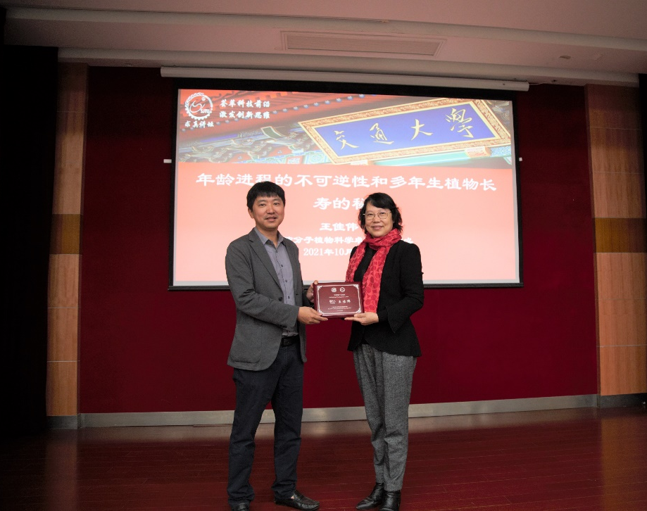 10月20日上午,中科院分子植物科学卓越研究中心王佳伟研究员应邀做客求真讲坛,做题为《年龄进程的不可逆性和多年生植物长寿的秘密》主题报告。来自生命科学技术学院、农业与生物学院、系统生物医学研究院的教师、博士后、研究生等66人参加了本次讲坛。讲坛由生命科学技术学院副院长林双君教授主持。