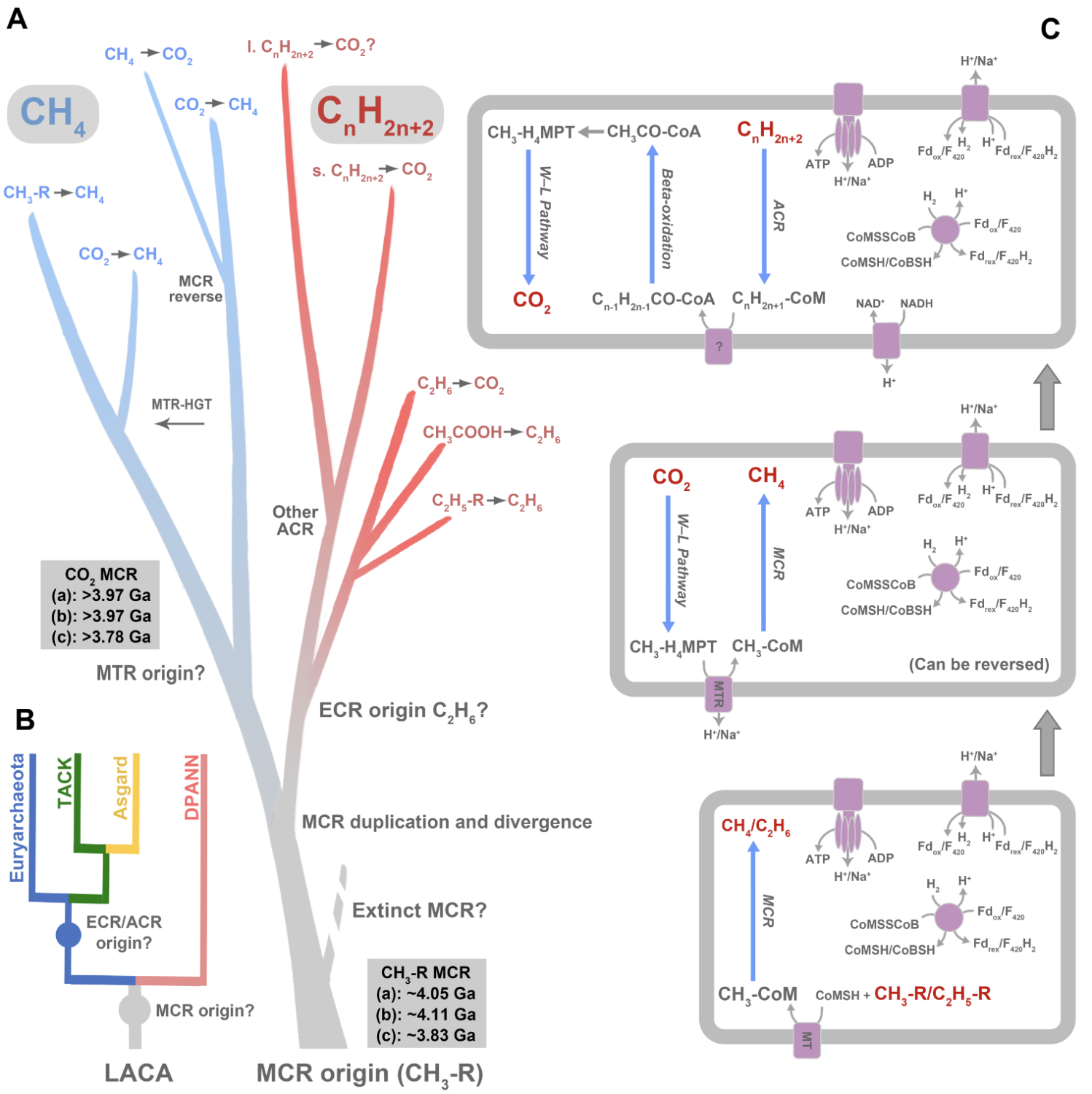 (A)甲烷及多碳烷烃代谢功能基因起源与演化示意图;(B)甲烷及多碳烷烃代谢古菌的起源和分化过程;(C)从最早的甲基型产甲烷代谢类型,到二氧化碳还原型产甲烷类型,到多碳烷烃代谢类型的代谢模式图。