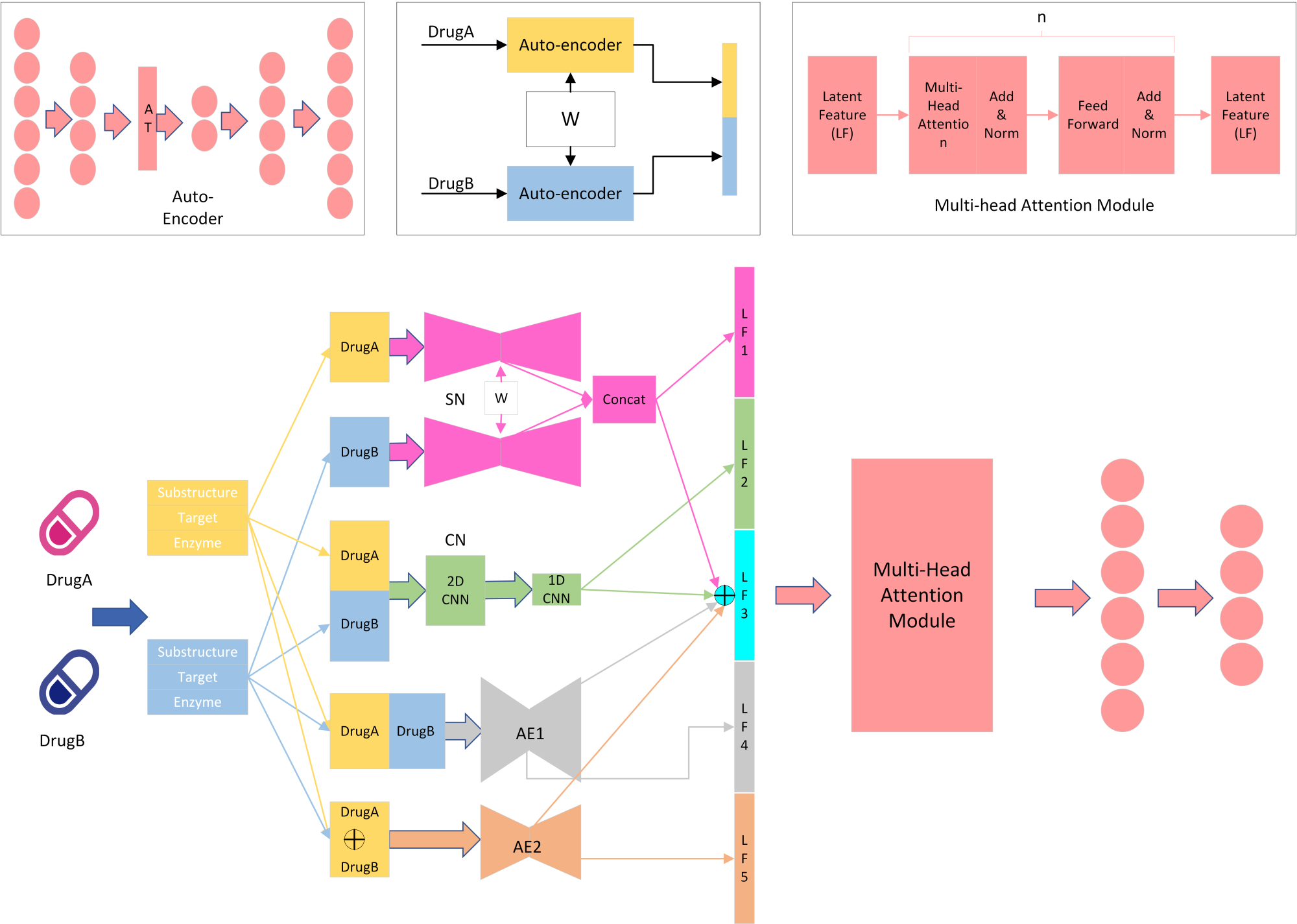 联合使用多种药物的主要问题之一是:可能会引起药物的不良相互作用和副作用,损害身体。因此,预测潜在的药物相互作用非常重要。然而,现有的预测方法大多只能预测两种药物是否相互作用,能预测两种药物相互作用事件的方法很少。准确预测两种药物的相互作用事件对研究人员研究两种药物的相互作用机制更有帮助。本文提出了一种基于多源药物融合、多源特征融合和transformer自注意力机制的药物-药物相互作用(DDI)事件预测方法——MDF-SA-DDI。MDF-SA-DDI主要由多源药物融合和多源特征融合两部分组成。首先,利用四种不同的药物融合网络(孪生网络、卷积神经网络和两个不同的自编码器)来获得药物的四种不同的潜在特征向量对。然后,使用自注意力机制模块进行隐特征融合。论文在两个数据集上对三个不同的任务进行了实验。在小数据集上,该模型在任务1上的AUPR和F1得分分别达到0.9737和0.8878,优于最新的方法。在大数据集上,该模型对task 1的AUPR和F1评分分别达到0.9773和0.9117。在两个数据集的任务2和任务3中,该模型也取得了与最好的模型相同或更好的性能。更重要的是,作者对五类DDI事件进行了案例研究,并取得了令人满意的效果。源代码和数据可以在https://github.com/ShenggengLin/MDF-SA-DDI上找到。