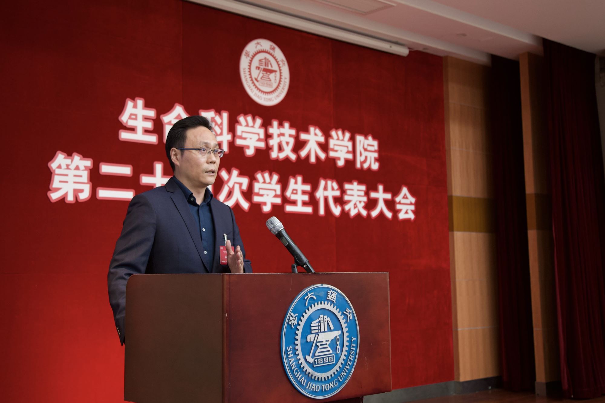 生命科学技术学院党委书记顾建平致辞。顾建平代表学院党委向大会的顺利召开表示热烈祝贺,向多年来关心和支持学院学生工作的校团委和各兄弟院系表示感谢。顾建平向学生会、研究生会以及各位学生代表提出期望:要坚持价值引领,在两个百年的历史交汇期,生科学子要厚植家国情怀,勇担时代使命;要坚持服务同学全面发展,注重综合素养的总体提升和身心健康;要凸出学术追求,培养学术志趣,能够全身心投入到生命科学的曼妙世界。最后,他强调学生会及研究生会要加强组织建设,学生干部要发挥好排头兵、领头羊的骨干作用,坚持乐于奉献,风清气正的初心,促进自我与他人的共同成长。