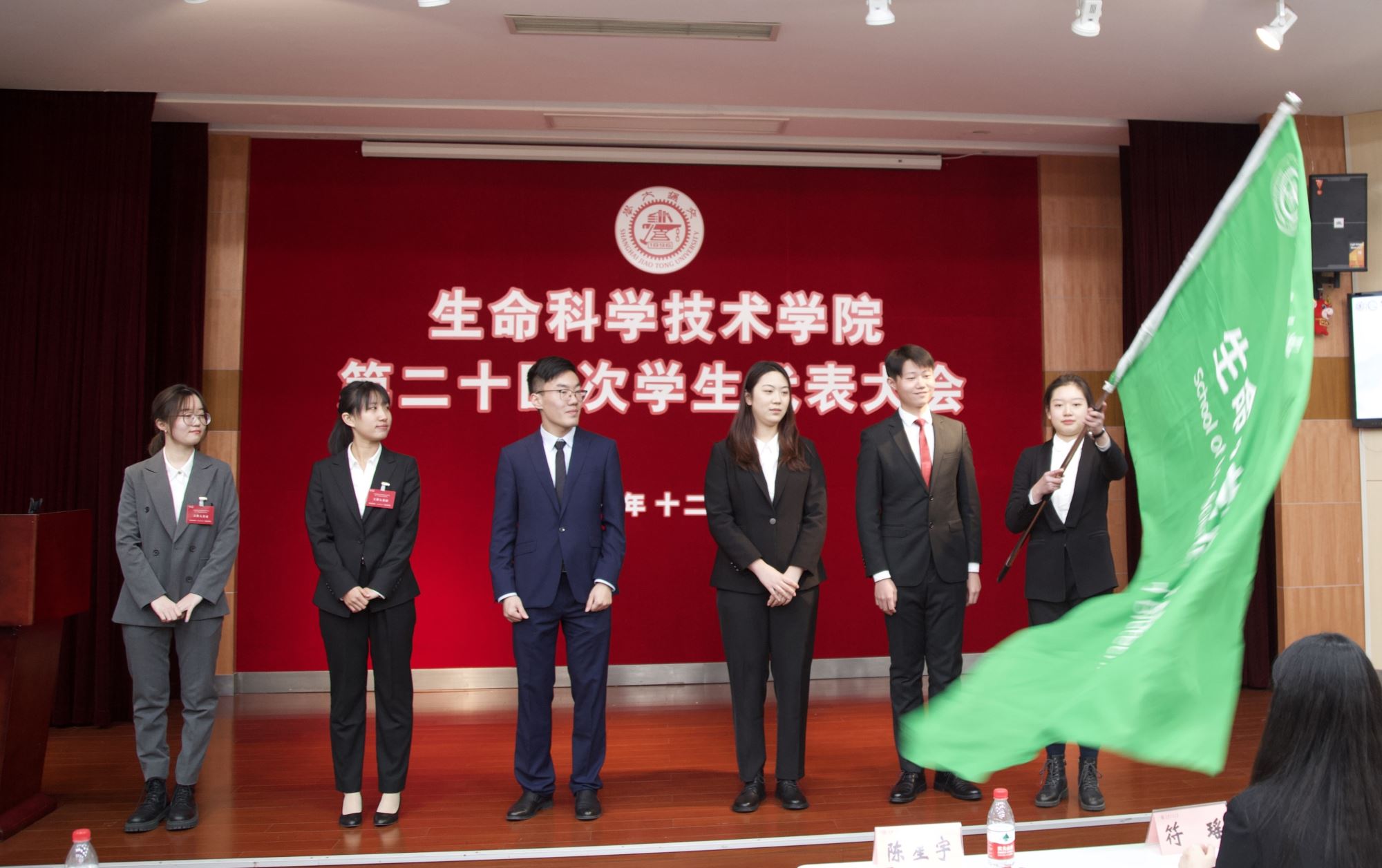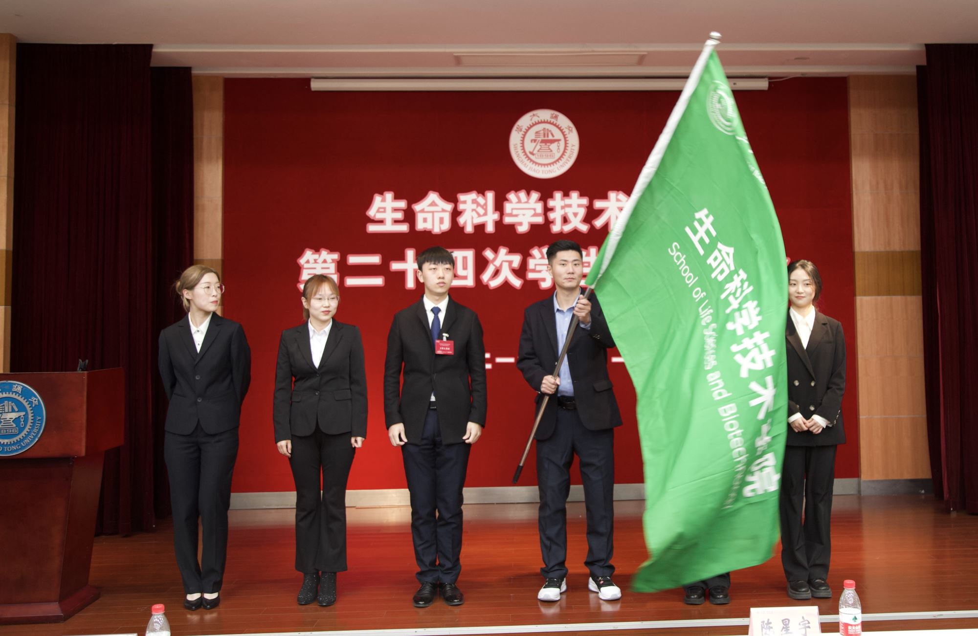 新老主席团院旗交接仪式中,新任主席团成员接过代表责任与使命的院旗,象征着生命科学技术学院学生工作的传承与发展。