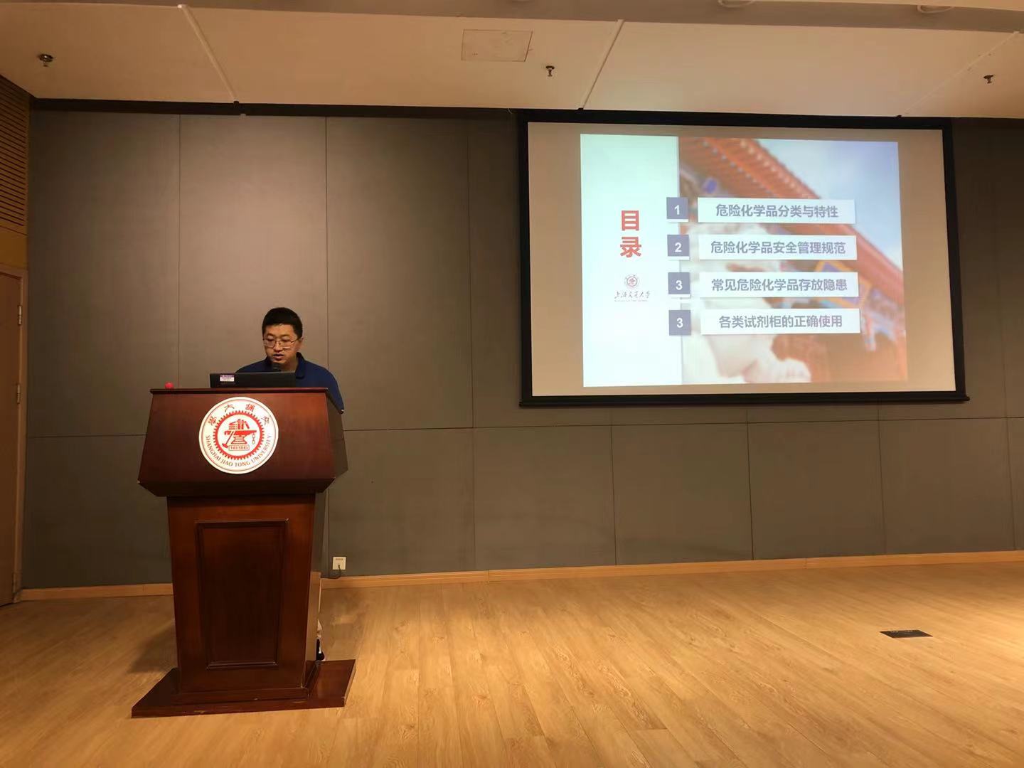 学校安全办刘闯作上海交通大学化学品安全管理专题培训,介绍了危险化学品分类及特性,危险化学品安全管理规范,常见危化品存放隐患,并重点介绍了各类试剂柜的正确使用要求。