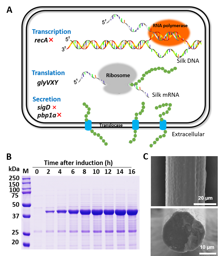 图1.微生物高效分泌蛛丝蛋白及人工纺丝