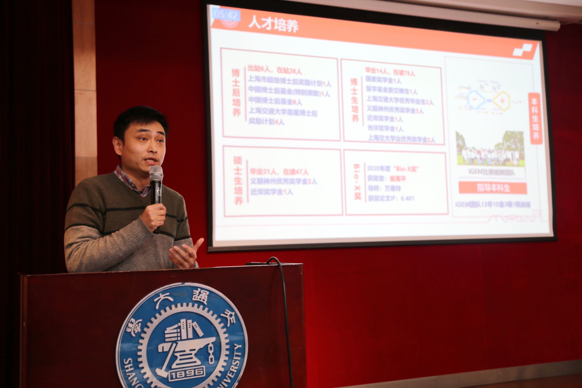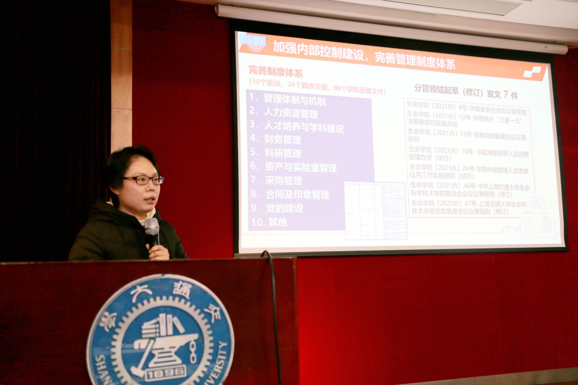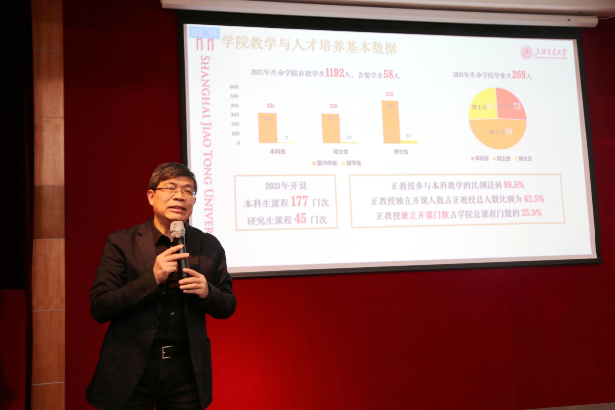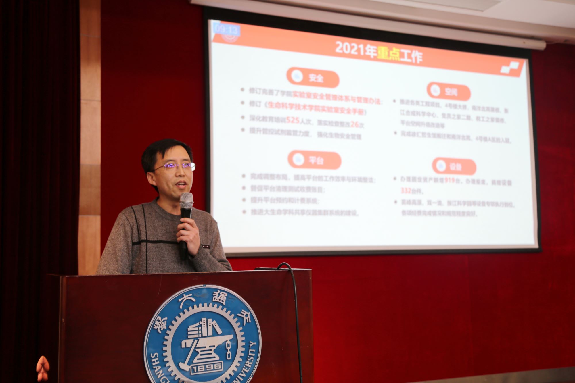 2022年1月13日,上海交通大学生命科学技术学院2021年度总结大会在生命药学楼树华多功能厅召开。院长邓子新,党委书记顾建平,常务副院长冯雁,党委副书记李文纯、王鑫,副院长李志勇、张晓君、林双君、师咏勇,以及学院全体教职工参加大会。上海交通大学机关党委副书记陈鹏、人力资源处教师发展与培训中心赵文芳出席学院正职领导述职环节。大会由顾建平主持。