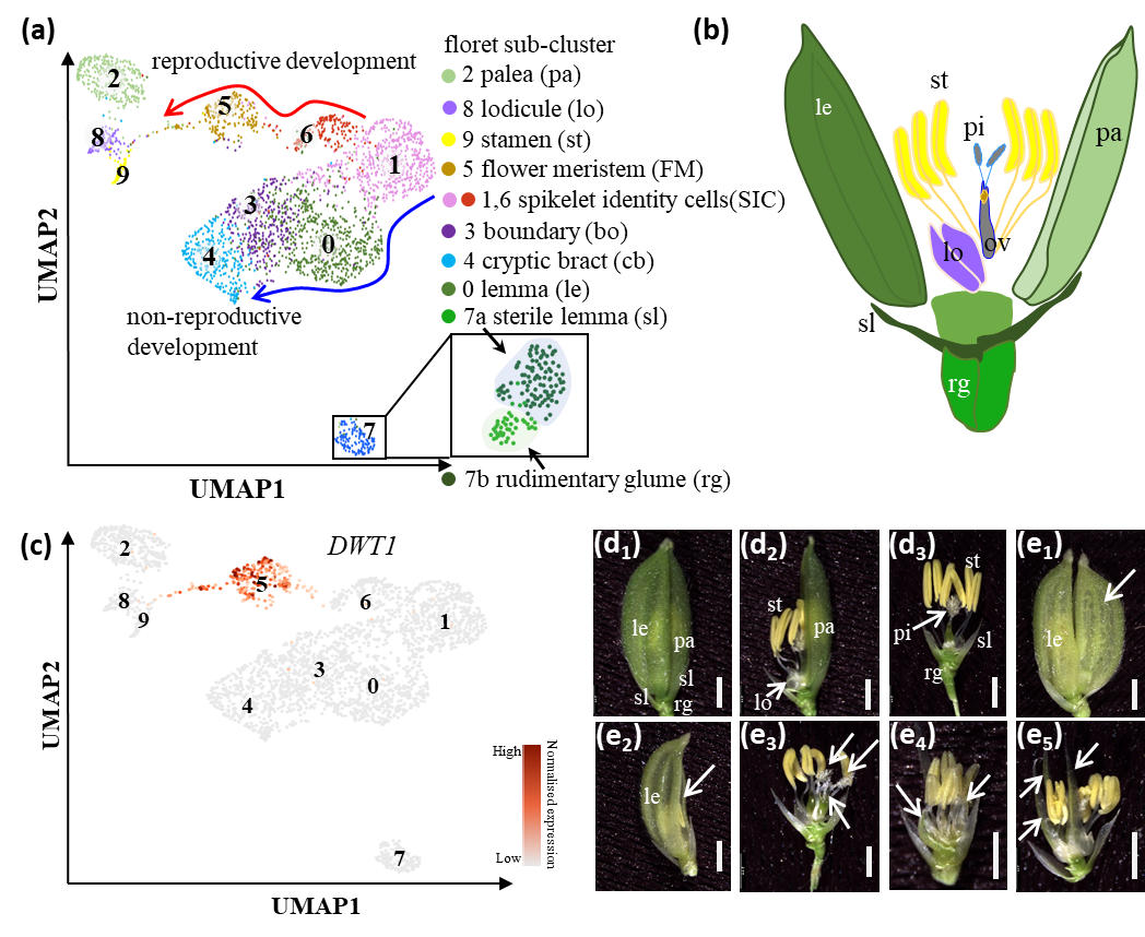 (a) 水稻花的UMAP图,显示10个花细胞亚分群。红色和蓝色箭头表示花细胞的两条发育轨迹:生殖器官(FM、pa、lo、st等花组织)和非生殖器官(cb、le、sl, rg等苞叶类附生组织)。(b) 小穗和花结构示意图。(c) DWT1在FM中高富集。(d) 野生型9522小穗的表型。(e) dwt1突变体花表现出内稃异常(e1)或缺失(e2)、多雌蕊(e3)、和伸长的颖片状浆片(e4,e5)等表型。