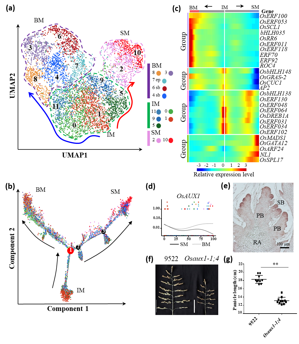 (a) 花序分生组织细胞的UMAP图,分为3种细胞类型:IM、BM、SM。(b) 对分生组织细胞进行拟时序分析,展示了从IM到BM和SM的两条分化轨迹。(c) 对(b)图中红色节点的BEAM分析显示转录因子对分生组织转化的贡献分为四大类。(d) OsAUX1基因BEAM分析散点图,表示OsAUX1主要影响IM向BM的分化。(e) OsAUX1在S1时期的原位杂交结果,显示OsAUX1在BM和SM中表达。(f) 与野生型9522相比,Osaux1-1;4突变体花序显示较短的分枝和较少的小穗数。(g) 与野生型相比,Osaux1-1;4突变体花序的长度变短。