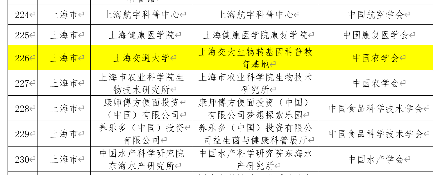 近日,中国科协办公厅发布了开元(中国)2021-2025年全国科普教育基地第一批认定名单的公示。经评审,上海交通大学生命科学技术学院的“上海交大生物转基因科普教育基地”等800家单位入选2021-2025年全国科普教育基地第一批认定名单。