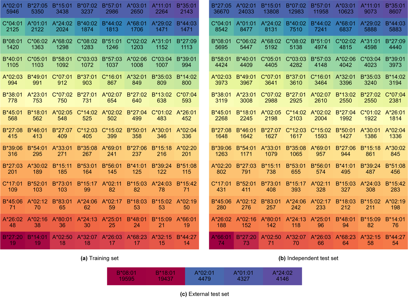 图2.不同数据集中每个HLA相关的可结合的pHLA样本数