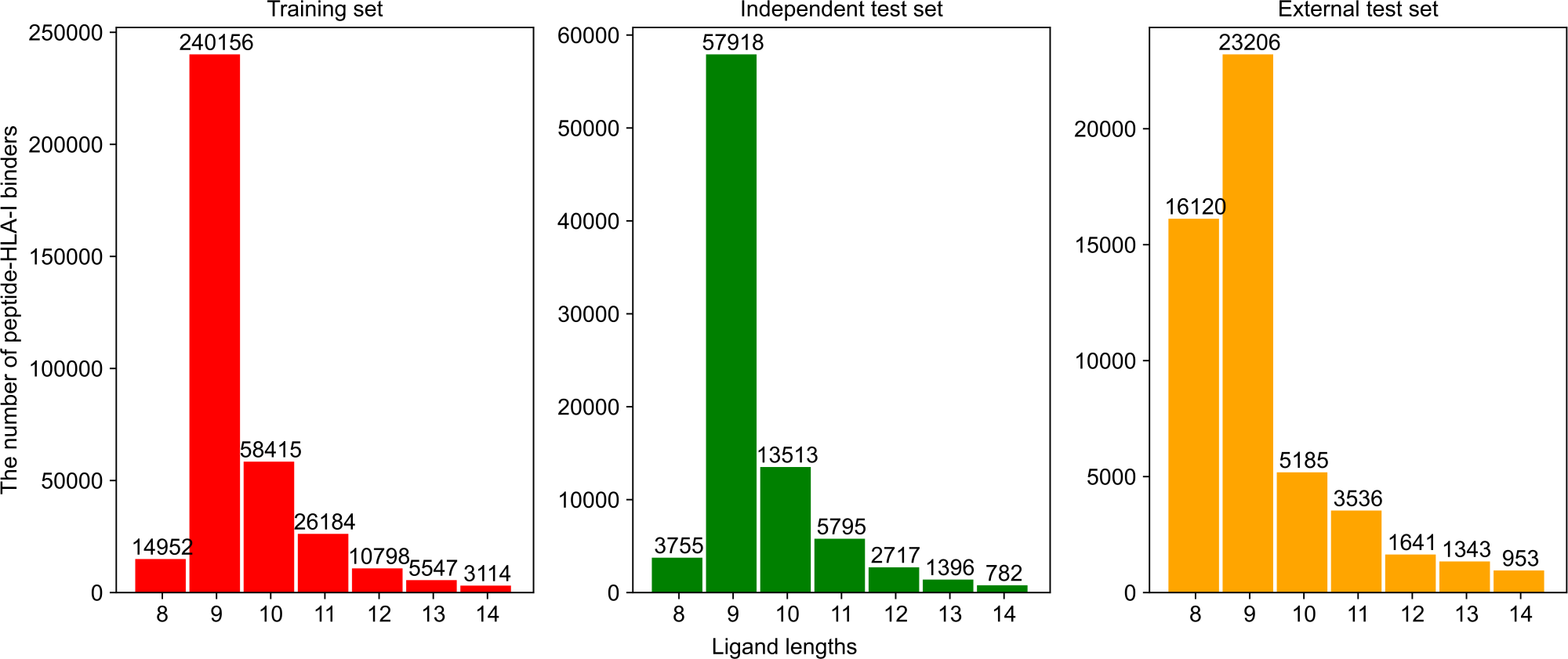 图3.不同数据集中肽长度相关的可结合的pHLA样本数