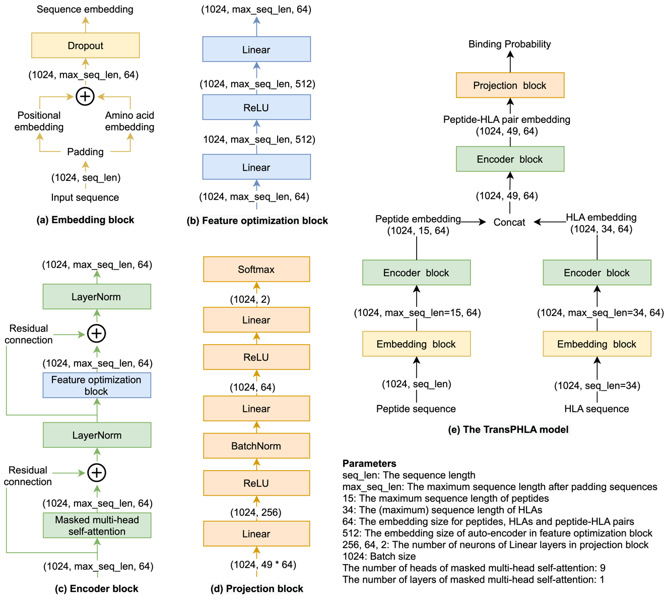TransPHLA的核心思想是自注意力机制的应用。TransPHLA由以下四个模块组成(图4):首先使用embedding block将positional embedding添加到amino acid embedding中,以生成sequence embedding,然后应用dropout技术来增强鲁棒性。通过embedding block,TransPHLA分别生成肽和HLA的embedding。接下来,这些embedding将分别作为Encoder block的输入。Encoder block包含masked multi-head self-attention mechanism和feature optimization block。Feature optimization block是先上升后下降的全连接层的组合,这个模块使得注意力机制得到的特征表示更好。然后,将输出的肽和HLA的特征表示连接,作为pHLA的embedding。在pHLA的embedding通过encoder block后,使用projection block预测pHLA的结合分数。