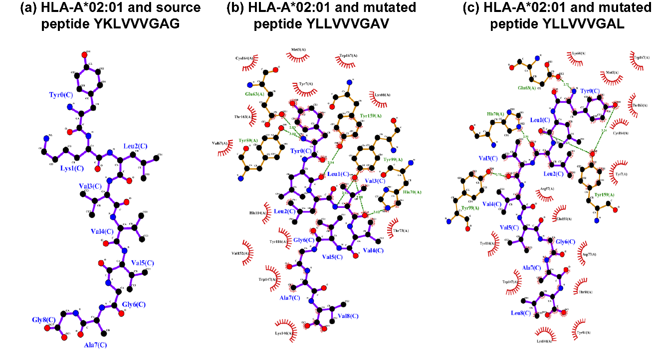 图8.分子动力学模拟的肽和HLA-A*02:01的2D结构。氢键显示为黄色虚线