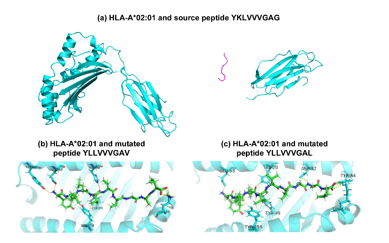 图9.分子动力学模拟的肽和HLA-A*02:01的3D结构。(a)中的源肽链显示为紫红色卷线,氢键显示为黄色虚线