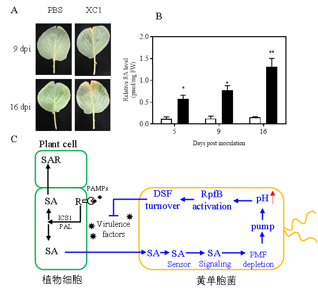 图1.水杨酸诱导DSF群体感应信号翻转的分子机制模式图.(A)野油菜黄单胞菌(Xcc)侵染甘蓝叶片,引起V-型病斑;(B)Xcc侵染诱导甘蓝大量产生SA信号分子;(C)SA直接作用于Xcc,诱导DSF信号分子翻转的通路模式图。