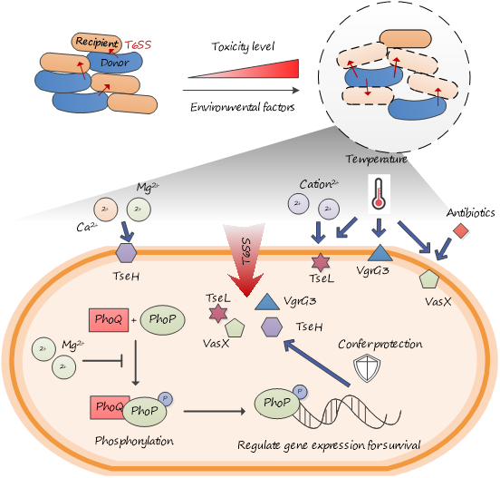 在本研究中发现,不同来源的LB固体培养基等环境因素显著影响了霍乱弧菌中T6SS效应蛋白的杀伤效果。培养基中镁离子和钙离子成分以及培养温度决定了不同效应蛋白对细菌的杀菌效果。通过遗传和转录组分析等手段,本研究阐明了镁离子Mg2+响应的PhoPQ双组分调控系统在大肠杆菌中起着重要的保护作用(图1)。霍乱弧菌存在于离子含量丰富的水体环境中,可以通过被污染的水源或食物进入到人体肠道内。本研究发现二价阳离子显著增强了霍乱弧菌中毒素蛋白的杀菌活性,意味着在自然和宿主环境中,T6SS可能有着实验室条件下检测不到的杀菌作用和功能。