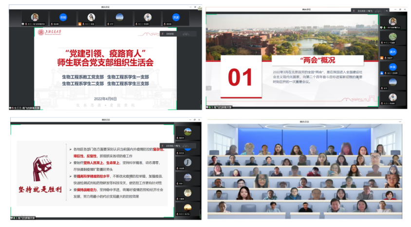 在校内外疫情防控的攻坚时期,为加强疫情期间师生的沟通和交流,鼓舞师生战胜疫情的决心和信心,发挥党支部的战斗堡垒作用,2022年4月6日,生物工程系教工党支部与研究生第一、第二和第三党支部联合举行了 “党建引领、疫路育人”线上组织生活会。自2020年开始,师生联合党支部会已经连续开展三年,在老师和同学中有着良好的反响。