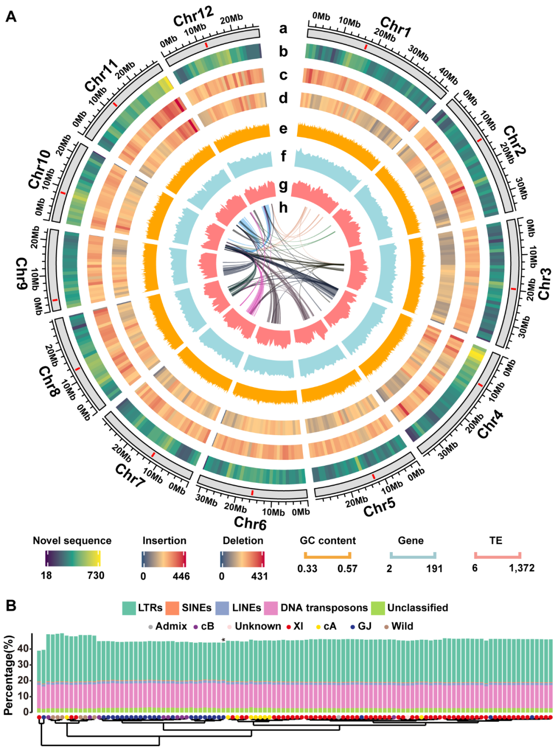 该研究通过引入一系列新方法处理长读长测序,构建了针对三代测序(TGS)数据的水稻泛基因组构建方法。与水稻参考基因组日本晴相比,新方法从105 个栽培稻(OS)构建的泛基因组包含 604 Mb 的新序列,比此前由~3000 个栽培稻品种二代测序数据(SGS)构建的泛基因组(~270Mb新序列)更全面。其中,重复序列是新序列的主要组成部分。加上6个野生稻(OR)品种,水稻泛基因组比现有参考基因组多879 Mb新序列和19,000个新基因。此外,该研究还为所有代表性水稻群体创建了9个高质量的参考基因组,包括 5 个无间隙参考基因组。