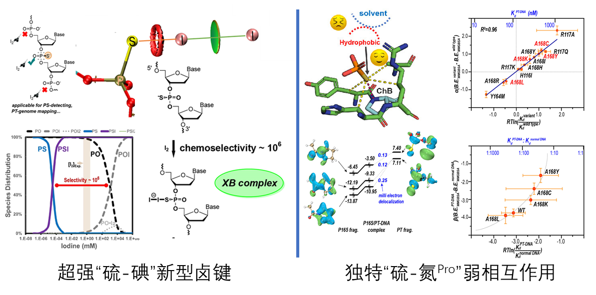近日,综合性权威杂志《Proceedings of the National Academy of Sciences of the United States of America》和物理化学专业期刊《Physical Chemistry Chemical Physics》上发表了上海交通大学生命科学技术学院、微生物代谢国家重点实验室赵一雷教授研究团队在硫修饰DNA研究的最新进展, 分别题为“Origin of iodine preferential attack at sulfur in phosphorothioate and subsequent P-O or P-S bond dissociation”(PNAS, 2022, 119(17):e2119032119)、“Molecular recognition between bacterial phosphorothioate DNA and sulfur-binding domain (SBD): competition between the water cage and chalcogen-hydrophobic packet”(PCCP, 2022, 24: 9176 - 9187)两篇开元(中国)硫修饰DNA中“硫-碘”强卤键和“硫-氮Pro”弱硫键的研究成果。PNAS工作阐明了磷硫酰化修饰位点与碘分子之间超强“硫-碘”卤键引发了一系列化学反应, 导致在硫修饰位点发生DNA骨架剪切或硫氧转化,揭示了在碘切法深度测序中硫修饰位点高选择性剪切的分子机制。PCCP工作阐明了硫结合蛋白SBD利用脯氨酸的非氢键骨架氮的特殊电子结构高效区分正常DNA和硫修饰DNA,提出了“硫键-疏水”协同推拉分子识别机制。