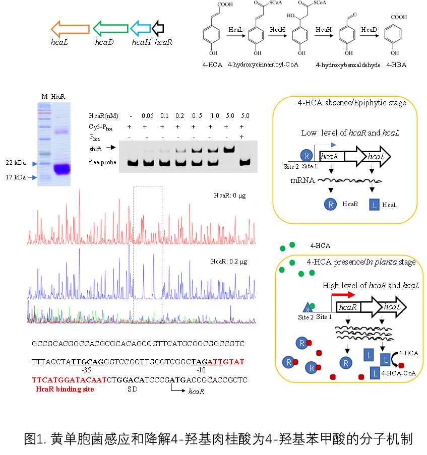 该研究首先在十字花科植物甘蓝叶片中检测出4-羟基肉桂酸(4-HCA)、阿魏酸(FA)、芥子酸(SiA)、咖啡酸(CA)和4-羟基苯甲酸(4-HBA)。野油菜黄单胞菌(Xanthomonas campestris pv. campestris, Xcc)能有效降解这些酚酸类化合物。Xcc中操纵子hcaRHDL编码一个MarR家族转录因子、辅酶A水合酶、脱氢酶和辅酶A连接酶,负责将4-HCA、FA和SiA分别转化成为4-HBA、香草酸和丁香酸(图1)。研究发现,当Xcc处于无酚酸的生长环境或附生在植物表面,转录因子HcaR结合在hca操纵子启动子Phca "ATTGTATCCATGAAATACAATCTAG"位点,与-10 box重叠,抑制hca操纵子的表达。当Xcc处于富含酚酸的生长环境或侵入植物体内,酚酸诱导hca操纵子表达。表达的HcaL将酚酸转化成酚酸辅酶A,酚酸辅酶A作为效应物结合HcaR,导致HcaR从启动子Phca上的结合位点释放下来,进一步促进了hca操纵子的表达,加速酚酸的降解(图1)。监测hca表达的报告菌株XC1::Phca-gusA侵入萝卜叶片后,可以在叶片中明显检测到GUS活性,表明hca操纵子在Xcc侵染过程中表达;敲除hca显著降低野油菜黄单胞菌在甘蓝和萝卜上的致病力。