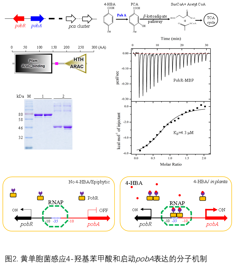 Xcc能够继续利用pobA/pobR位点编码的转录因子PobR感应4-HCA降解产物4-羟基苯甲酸(4-HBA),然后诱导4-HBA羟化酶基因pobA表达,将4-HBA转化为原儿茶酸,继而通过pca基因簇逐步转化生成乙酰辅酶A和琥珀酰辅酶A,最终进入三羧酸循环。研究表明,由于pobA基因启动子区域-10 box和-35 box的间隔碱基太长(21 bp),RNA聚合酶无法完全覆盖整个启动子区域,导致pobA无法正常表达。需要4-HBA与受体PobR结合后形成二聚化复合体,再结合到pobA基因启动子区域,协助RNA聚合酶启动pobA表达(图2)。上述研究结果充分说明快速感应酚酸的存在并启动酚酸降解和利用途径在植物病原黄单胞菌侵染过程中起重要作用,是植物病原黄单胞菌的一类新型致病机制。
