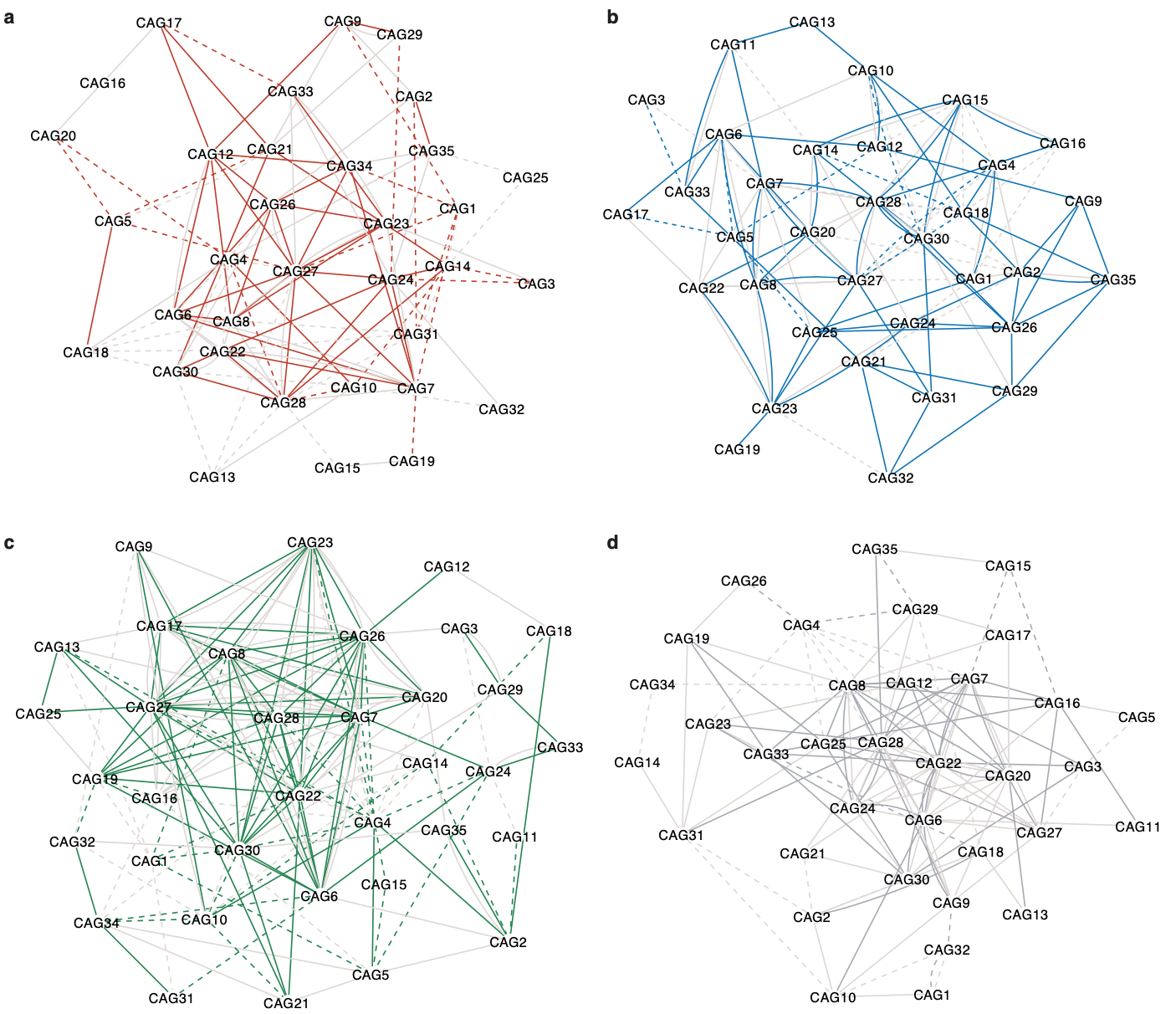 患者群体网络性质的分析显示,干预组(a:运动组,b:膳食组,c:运动+膳食组)在干预后网络的连接度、鲁棒性分数更高,而这些指标在对照组(d)都降低了(下图3)。考虑到肝脏脂肪堆积的改善情况,这些网络指标可能体现了患者对干预的响应。对网络结构的分析表明,群体网络是一种无标度网络,据此确立4个作为网络枢纽的基石类群CAG6、CAG7、CAG8和CAG28,其代表ASV分别属于拟杆菌属(Bacteroides)、瘤胃球菌科UCG-4(Ruminococcaceae UCG-4)、Alistipes和Subdoligranulum。