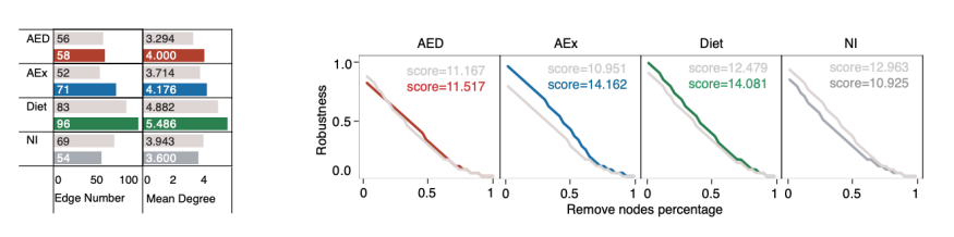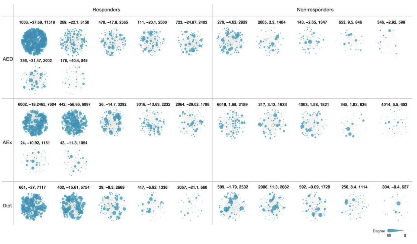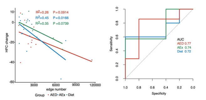 进一步通过干预前的个体网络中的边数来区分响应者/无响应者。在线性回归分析中,AEx组的个体网络边的数目准确地预测了HFC的变化,并具有显著性(下图5左)。为了评估个体网络中的边数对于干预响应的预测能力,研究者构造了一个无监督的分类器,发现不同干预组都显示出来良好的预测效果,其中AED组效果最好(下图5右)。上述宏基因组数据的结果也在16S rRNA数据中得到了验证。