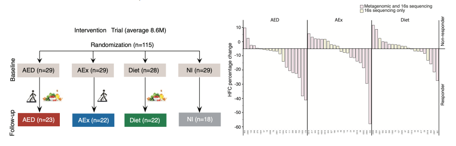 研究团队之前报道了一项为期8.6个月的四组(有氧运动AEx,n = 29;饮食Diet,n = 28;有氧运动+饮食AED,n = 29;无干预NI,n = 29)随机、单盲(针对研究人员),对NAFLD伴随糖尿病前期患者进行的对照干预试验(下图1左),以评估干预措施对肝脏脂肪含量和葡萄糖代谢的影响。本文中,研究团队报道了试验的第三个主要结果运动与膳食干预对肠道菌群的影响。
