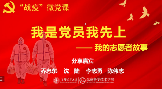 一个党员就是一面旗帜!自疫情发生以来,生命科学技术学院党员师生充分发挥先锋模范作用,带动全院师生一道投身抗疫一线,积极参加志愿服务工作,全体教职工党员社区“双报到”达到100%。为进一步弘扬志愿服务精神,4月16日上午,生命科学技术学院举行题为“我是党员我先上”的战疫微党课,邀请乔忠东、沈陆、李志勇、陈伟志四位党员师生代表分享“我的志愿者故事”。学院党政班子成员和全体师生党员近600人参加党课。会议由党委副书记王鑫主持。
